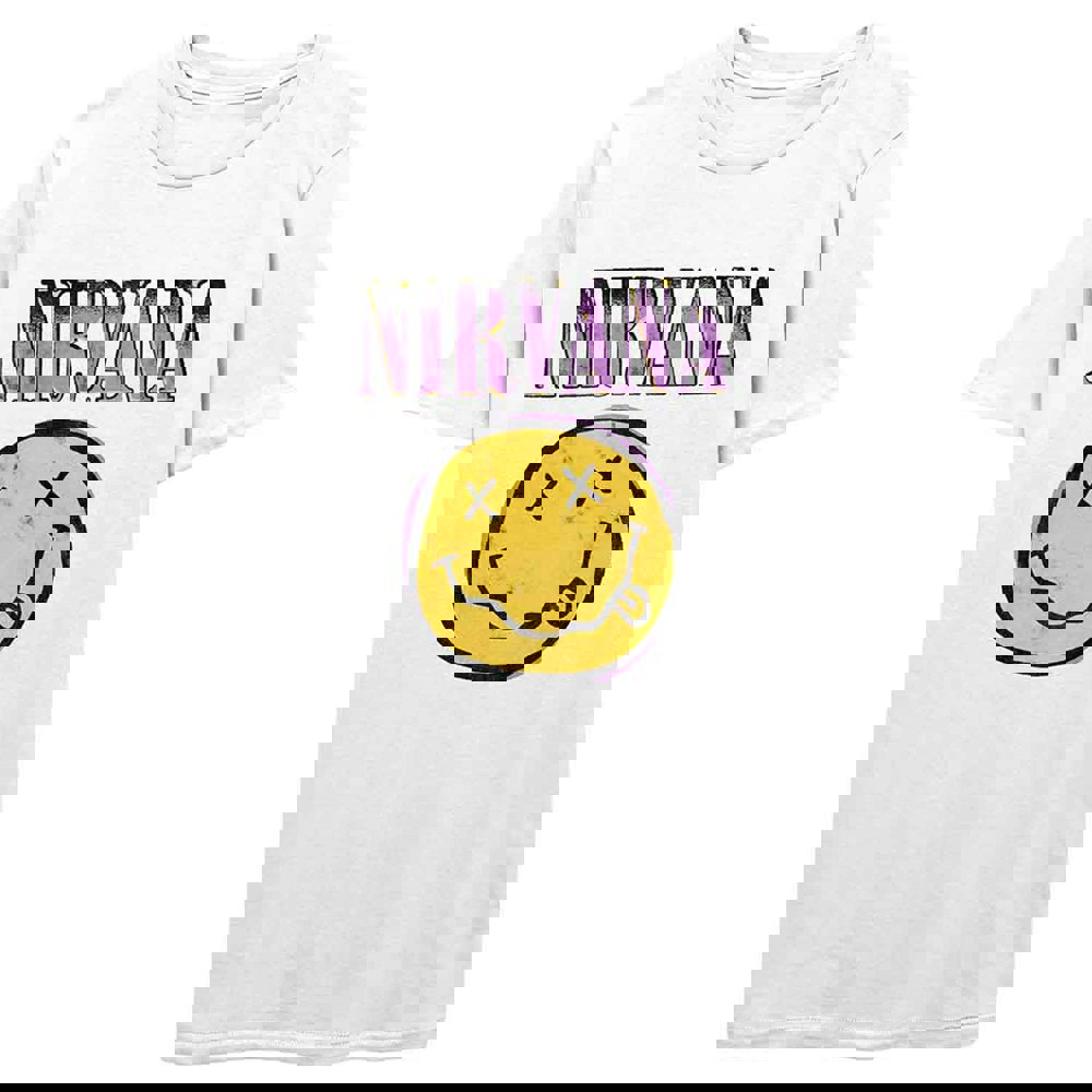 An official licensed Nirvana Unisex Tee featuring the 'Pink Grunge Smile' design motif. This high quality t-shirt design is available in the white colourway. Comes in a wide range of sizes from Small through XX-Large, subject to availability.