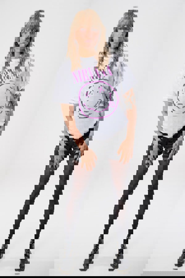 An official licensed Nirvana Unisex T-Shirt featuring the 'Purple Grunge Smile' design motif. This high quality T-Shirt is available in a white colourway. Classic fit soft-style cotton tee with short sleeves and crew neck. Features front printing. Comes in a wide range of sizes from Small through XX-Large, subject to availability.