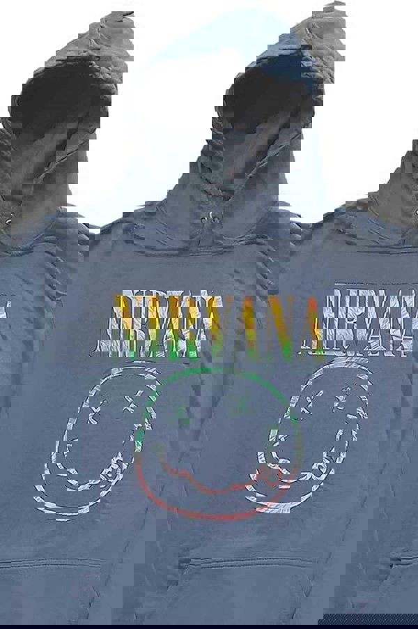 An official licensed Nirvana Unisex Pullover Hoodie featuring the 'Sorbet Ray Grunge Smile' design motif. This high quality Pullover Hoodie is available in a turquoise blue colourway. High quality cotton hooded top with draw string hood and pouch pockets. Features front printing. Comes in a wide range of sizes from Small through XX-Large, subject to availability.