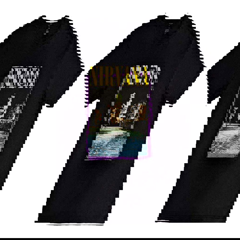 An official licensed Nirvana Unisex Tee featuring the 'Stage Jump' design motif. This high quality t-shirt design is available in the black colourway. Classic fit soft-style cotton short sleeved tee with crew neck. Comes in a wide range of sizes from Small through XX-Large, subject to availability.