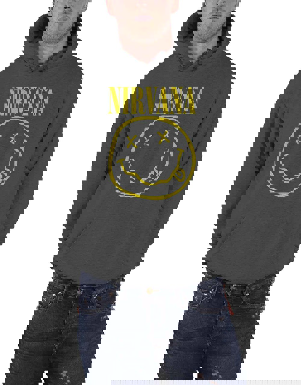 An official licensed Pullover Hoodie featuring the Nirvana 'Yellow Grunge Smile' design motif. This high quality Pullover Hoodie is available in a black colourway. Long sleeved pullover hoodie featuring front patch pockets. Comes in a wide range of sizes from Small through XX-Large, subject to availability.