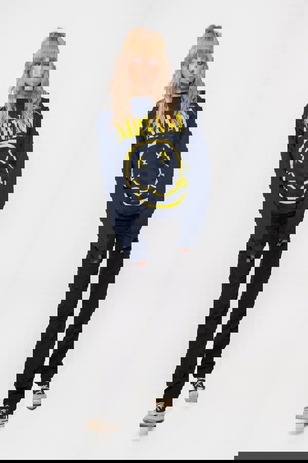 An official licensed Nirvana Unisex Sweatshirt featuring the 'Yellow Grunge Smile' design motif. This high quality Sweatshirt is available in a navy blue colourway. High quality cotton sweatshirt with long sleeves, features front printing. Comes in a wide range of sizes from Small through XX-Large, subject to availability.