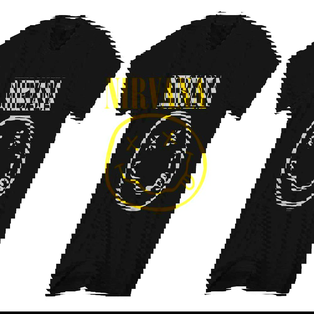 An official licensed soft-style cotton tee featuring Nirvana 'Yellow Grunge Smile' design motif. This high-quality Tee is available in a black colourway. Size options include Small through XX-Large.