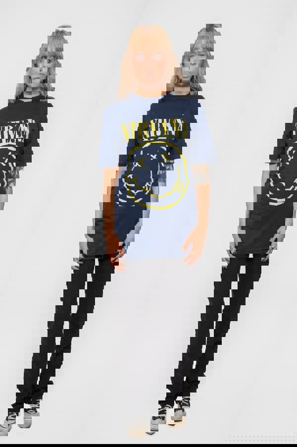 An official licensed Nirvana Unisex T-Shirt featuring the 'Yellow Grunge Smile' design motif. This high quality T-Shirt is available in a navy blue colourway. Classic fit soft-style cotton tee with short sleeves and crew neck. Features front printing. Comes in a wide range of sizes from Small through XX-Large, subject to availability.