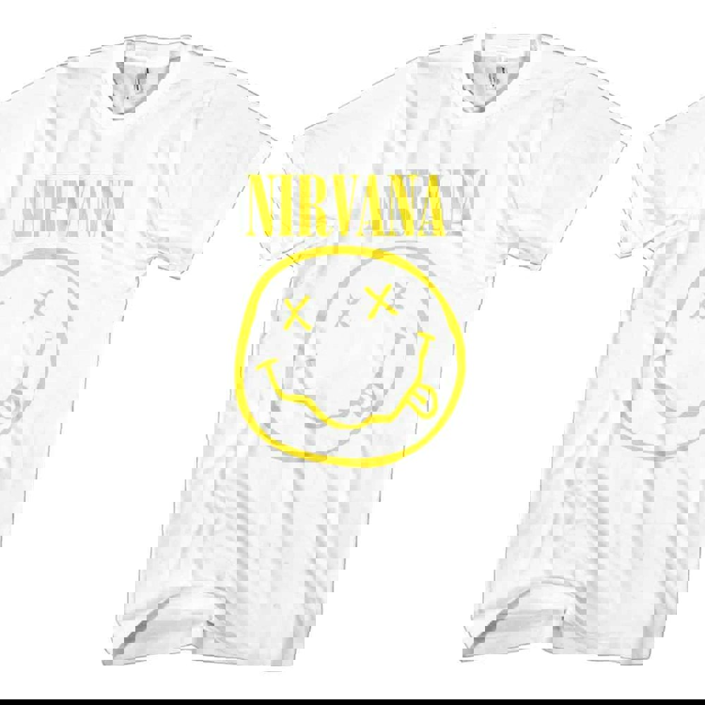 An official licensed Tee featuring the Nirvana 'Yellow Grunge Smile' motif. This high quality soft-style cotton tshirt is available in a white colourway. Comes in a wide range of sizes from Small through XX-Large, subject to availability.
