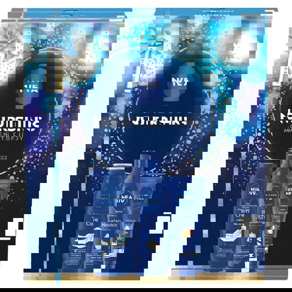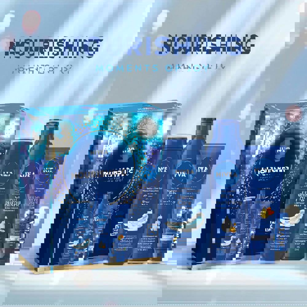 NIVEA Nourishing Moments of Joy Gift Set 4pc provides a luxurious pampering experience for body and skin. Designed to nourish hydrate and protect it includes a gentle shower cream rich body lotion soothing hand cream and nourishing lip balm. Perfect for gifting or personal indulgence this set keeps skin soft smooth and healthy every day.