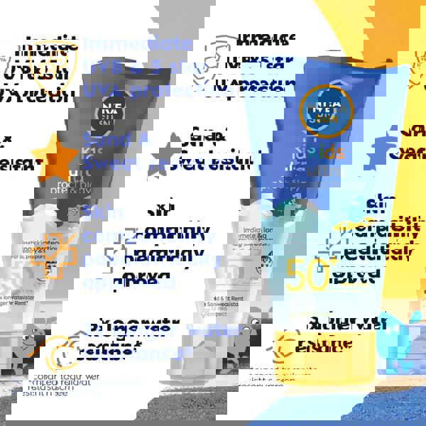 Built for days outdoors, Nivea Sun Kids Protect & Care Ultra Protect & Play SPF50+ Lotion is a kids’ sun cream with immediate, long-lasting UVA & UVB protection. Developed for children’s delicate skin, it helps to prevent sunburn and long-term UV damage while supporting the skin’s protective barrier and helping to prevent dehydration.
