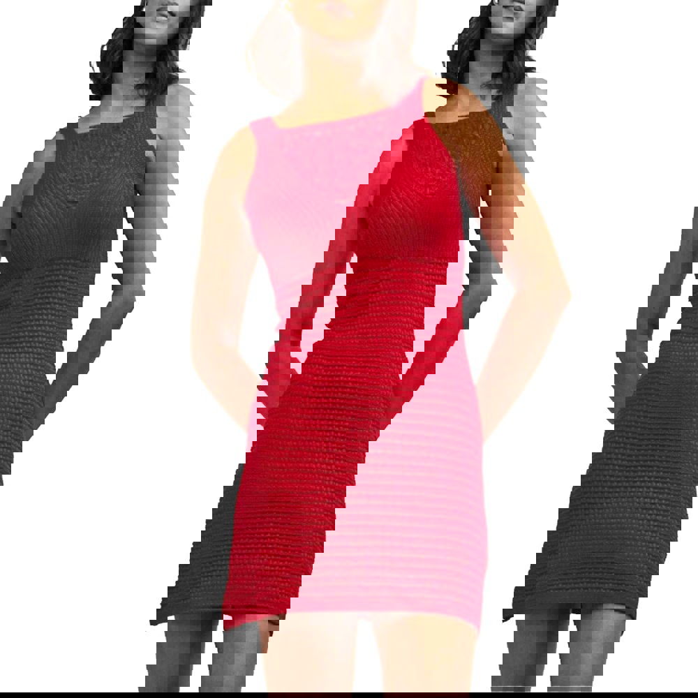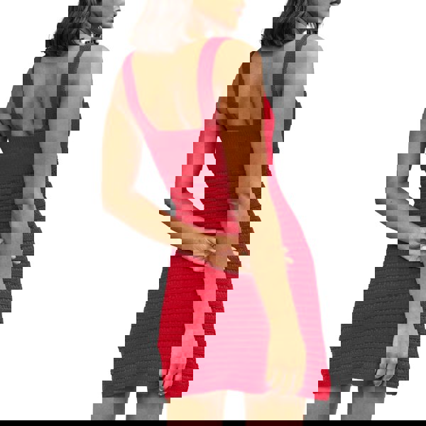 This knitted mini dress brings a clean, plain finish with mock crochet detailing for added texture. Cut with a square neckline and a sleeveless shape, it offers a simple silhouette that works well for warm-weather dressing and easy layering.