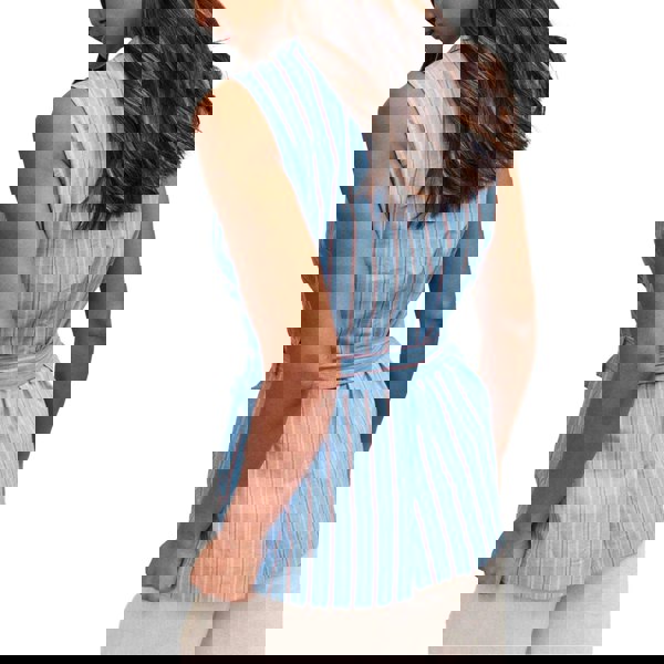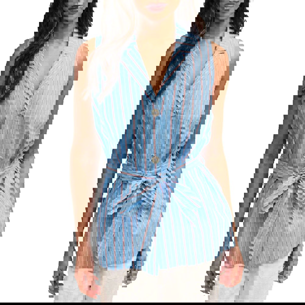 The Quinn waistcoat from Nobody’s Child is made in a cotton-blend material with a blue stripe design. A lapel neckline and sleeveless cut give it a clean, tailored look that works well for layering.