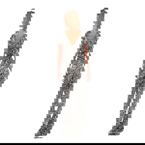 This multicoloured jumpsuit has a floral design with flutter short sleeves and a frill V neckline. A V-back adds shape at the rear, while the fitted waistline creates a defined silhouette. It pulls on for easy wear and includes a waist tie for adjustment.