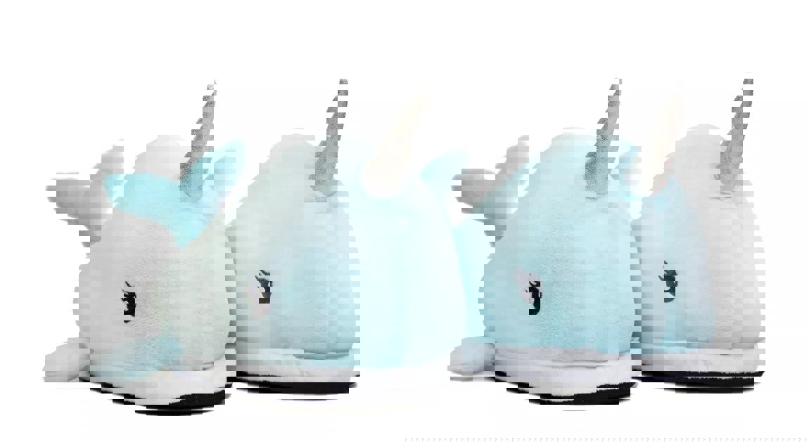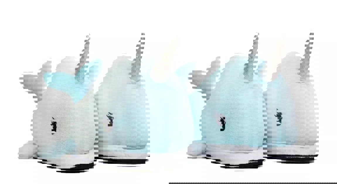 Cute plush narwhal design slippers with shimmer horn, padded throughout the foot, back and sides, outer material: polyester, closure: slip on, 100%polyester, one size only to fit adults 4-8