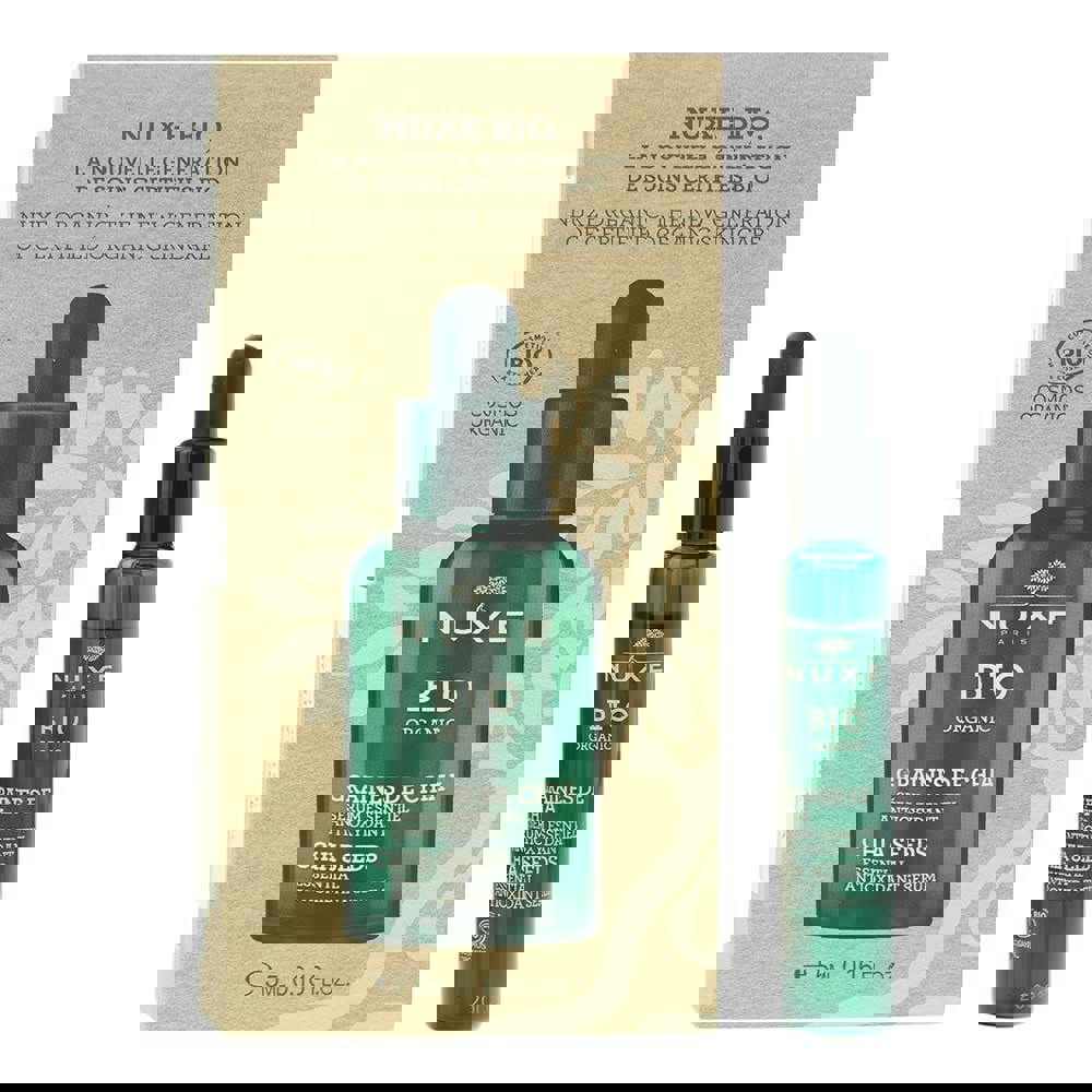 Nuxe Bio Organic Chia Seeds Antioxidant Serum is a targeted facial serum from the brand’s Bio Organic range. This 5ml size is suited to travel, trial, or keeping in a skincare bag for use as needed.