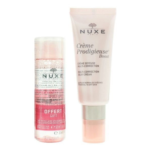 The Nuxe Creme Prodigieuse Silky 2 Piece Gift Set contains a multi-correct silky Cream and a hydrating 3-in-1 Micellar Water