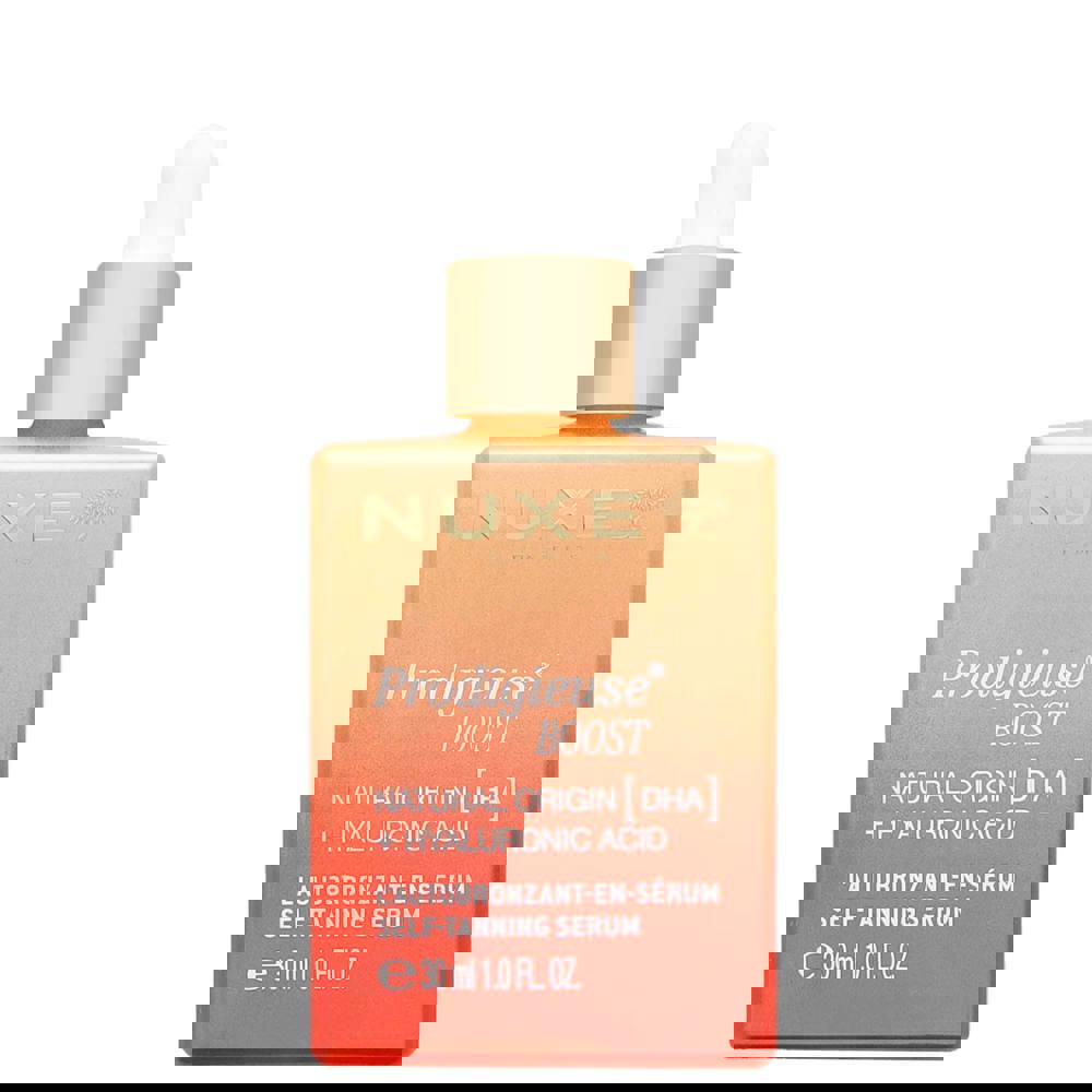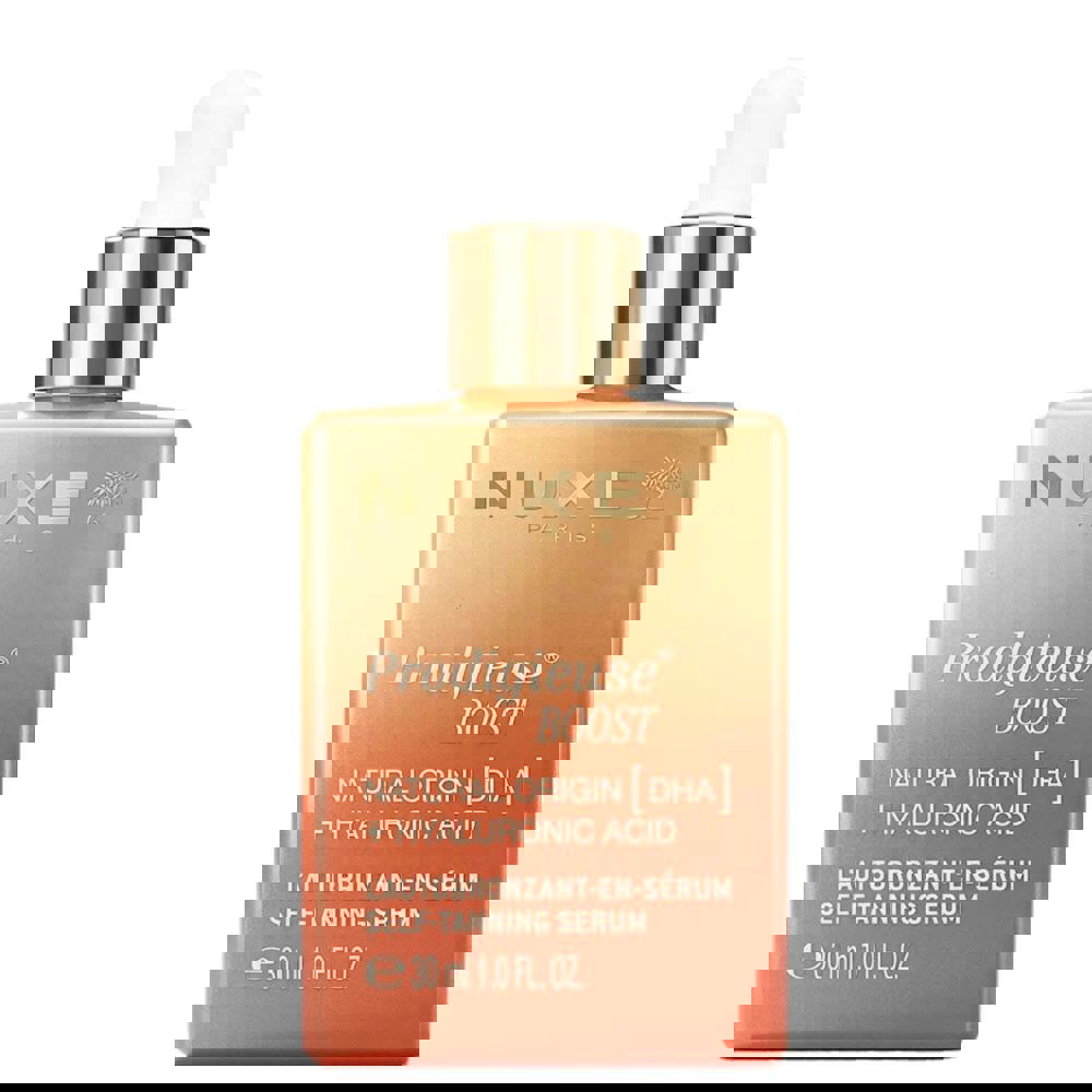 Nuxe Prodigieuse Boost Self Tanning Serum is a plumping self-tanning serum which offers the perfect blend of skincare and self-tanning benefits. Enriched with hyaluronic acid, this serum deeply hydrates and plumps your skin while gradually developing an even, sun-kissed tan. Formulated with 100% natural DHA.