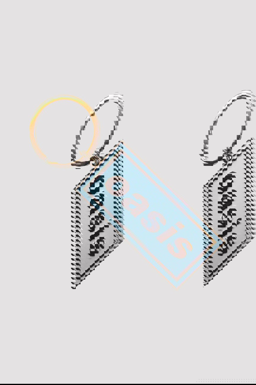 Official licensed Oasis Keychain featuring the 'Logo Sky Blue' design motif. Nickel plating.