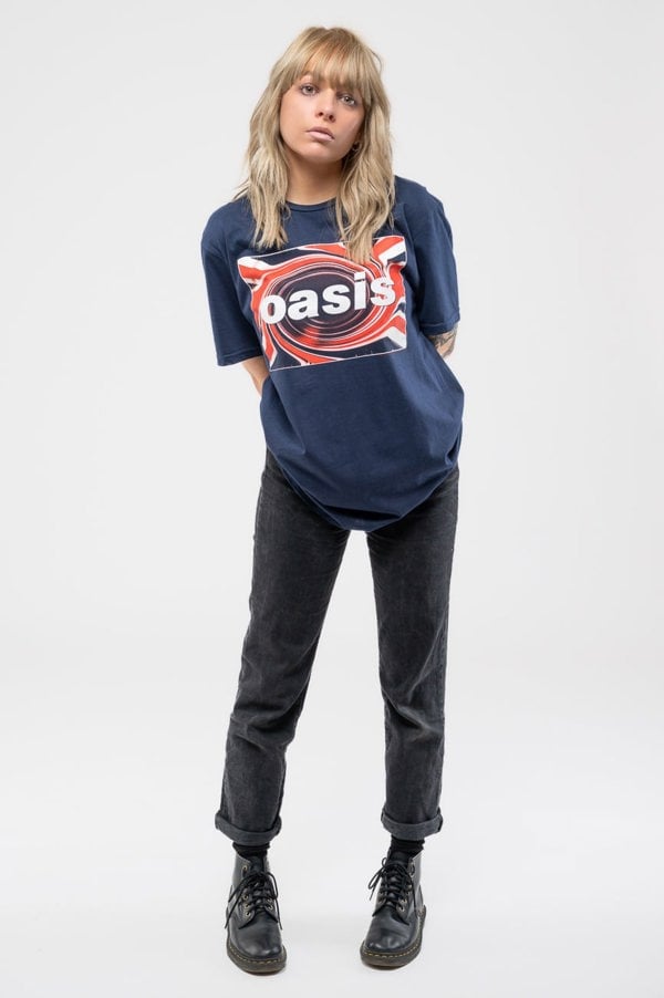 An official licensed Oasis Unisex Tee featuring the 'Union Jack' design motif. This high quality t-shirt design is available in the navy blue colourway. Classic unisex fit soft-style cotton tee with crew neck and short sleeves. Comes in a wide range of sizes from Small through XX-Large, subject to availability.