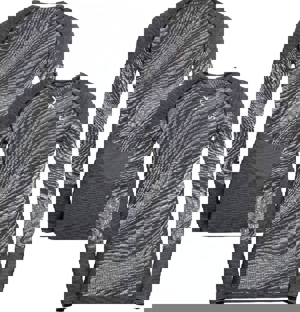 A Fitted base layer with seamless knit technology using recycled synthetic fibres for a quality, ethical result with integrated engineered Functional Zones™ as seen from the various fabric finishes within the garment that give the Blackcomb™ range their striking design, for optimal moisture management and superb ventilation and total breathability but no separate panels. . . . this is a single body-mapped torso with zero seams except where the sleeves attach to the body.