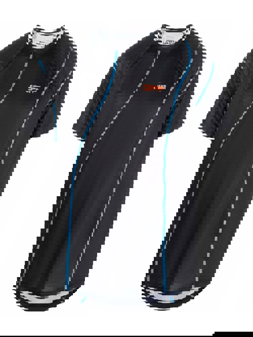 Active wear t-shirt from Off-White in black with blue stripes and orange arrows motif to the back.