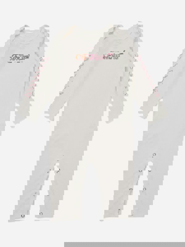 The babygrow has long sleeves, a ribbed crew neck and a snap closure for easy fastening. The bib also fastens with a snap closure. A logo print sits on the front, with Off-White iconic arrows on the sleeves. The hat is finished with a cuffed edge.