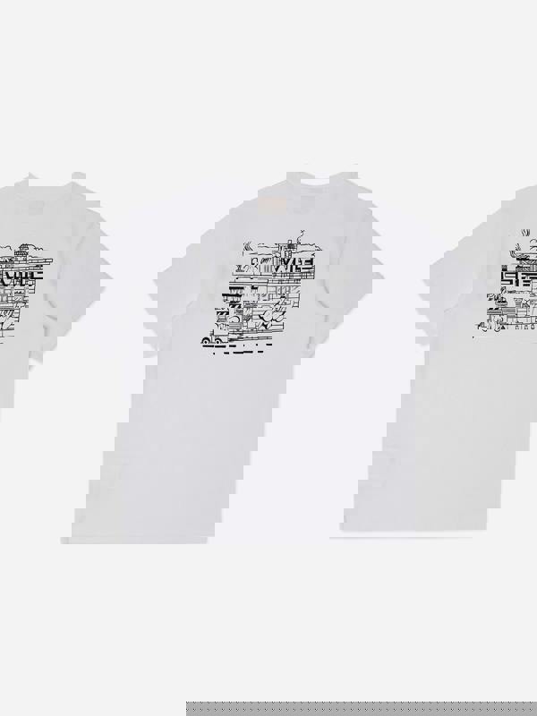 With its crisp white colourway and all-over print detail, this piece works as a standout top on its own or layered under lighter outerwear. The design keeps the focus on the artwork-inspired graphics, making it a distinctive option for off-duty days.