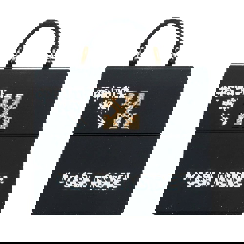 Finished in black, the case features a mix of printed and appliqué detailing, including an arrow motif and text design. A fold-over closure helps keep the case securely shut, making it a practical accessory for carrying your AirPods in a bag or pocket.