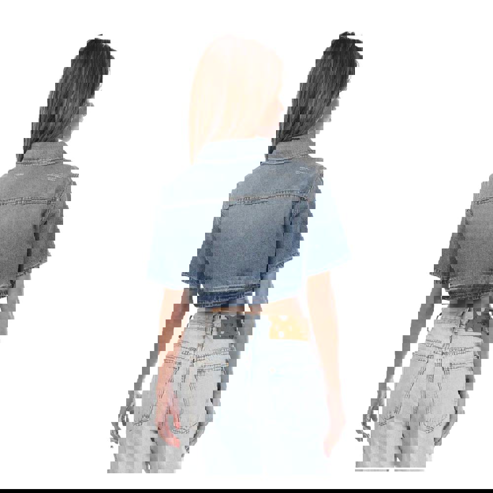 This cropped corporate shirt is made from 100% cotton and finished in a plain blue and white colourway. A draped collar adds a softer neckline detail, while the short sleeves keep the silhouette clean and streamlined.