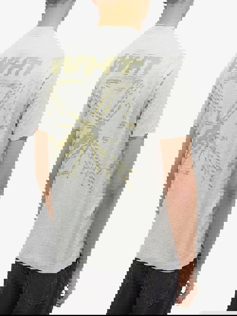 Short sleeve grey t-shirt from Off-White with beige 'Splash Arrow' motif on chest and enlarged on the back.