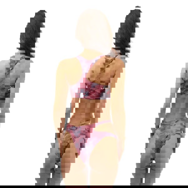 This women’s tie dye bikini set comes in an off white base with pink and blue tones. The top is styled with a square, wide neckline and a racerback, finished with a pull-on fastening. A one sleeve design and cut-out sections add a distinctive, modern shape.