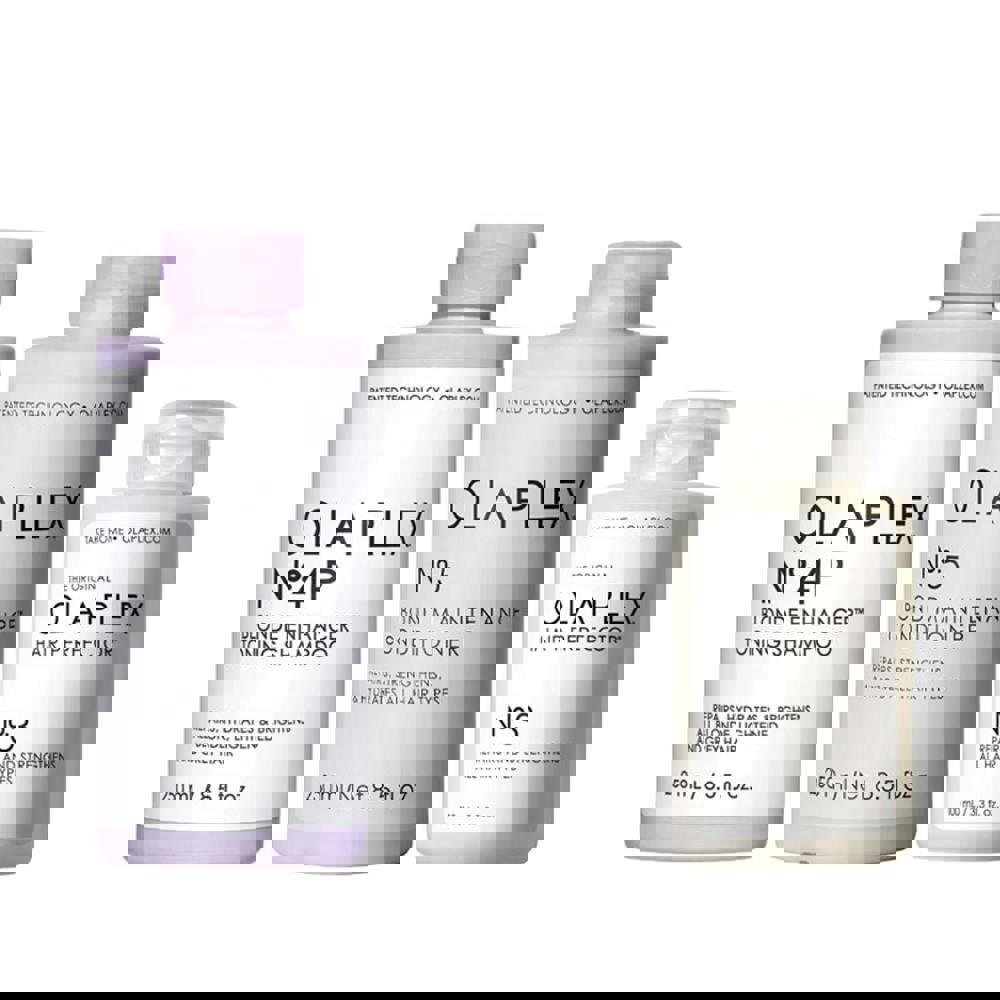 No.4P Blonde Enhancer Toning Shampoo is a highly concentrated purple shampoo that neutralises brassiness while cleansing, with Olaplex patented Bond Building Technology. Follow with No.5 Bond Maintenance Conditioner, a nourishing formula for all hair types that hydrates without weighing hair down and helps reduce breakage and improve manageability. Use No.3 Hair Perfector before shampooing as a targeted treatment for damaged hair, formulated to repair and strengthen with bond-building care.