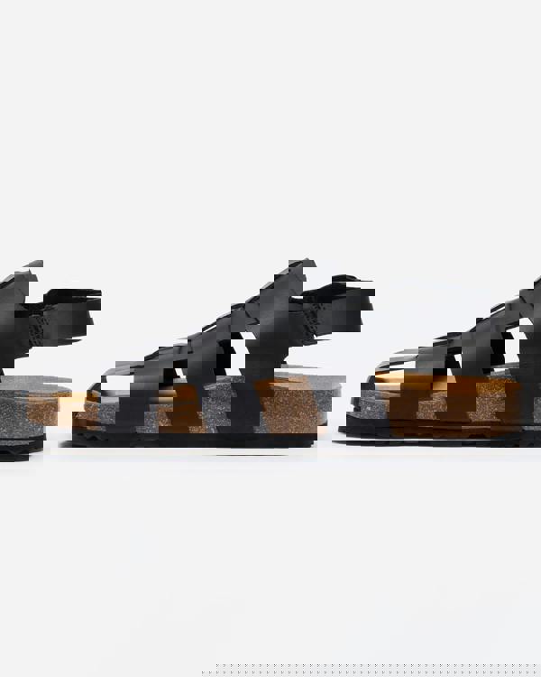 This Fisherman’s sandal is from Oliver Sweeney's specialist factory in Spain. The upper pattern was traditionally designed as cool summer footwear made from straps to allow water to flow out and secured to the foot with a back strap. The upper is a black oiled calf nubuck, with an antiqued brass buckle for the three-hole strap adjustment. Includes an extra layer of cushioning between the moulded cork footbed and the leather sock lining for additional comfort and added a light weight practical rubber outsole.