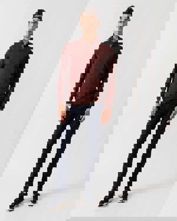 A ¼ zip funnel neck jumper in 100% merino wool from the renowned Zegna Baruffa Mill in Italy. Creafted with a super fine 27 gauge jersey knit in a dark red marl, fully fashioned with a dropped back shoulder seam to create a clean profile. The jumper has ribbed cuffs and hem and a sealed, rolled over neck rib with concealed zip placket. Merino wool is ideal for all year round.