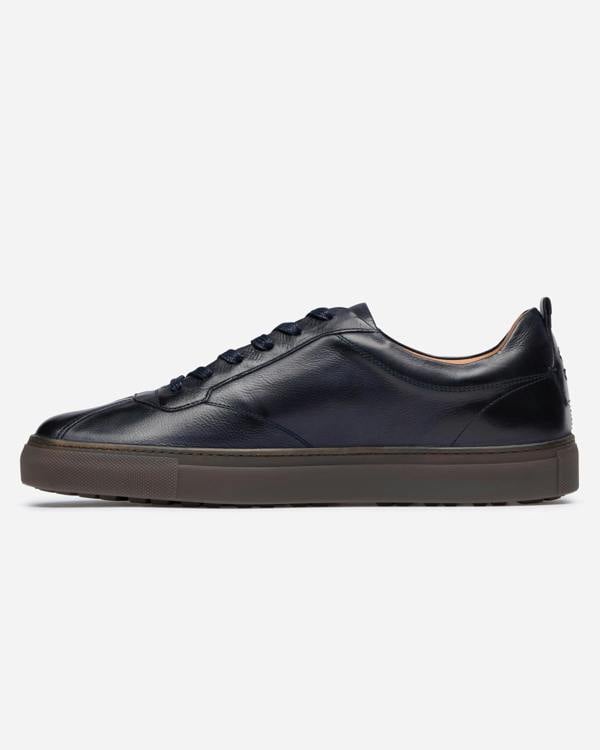 The Ermida trainer is made from navy veg tanned Garda leather from the Incas tannery, a premium calf leather with a non-uniform casual finish. The retro style of the upper is often referred to as a ‘soccer toe’ a pattern frequently used for professional sports shoes in the 60s and 70s, this model features a full leather lining, cushioned leather insock and padded collar to bring it up to date. The natural gum rubber cupsole has a shallow cleat for additional grip, secured with a side stitch.