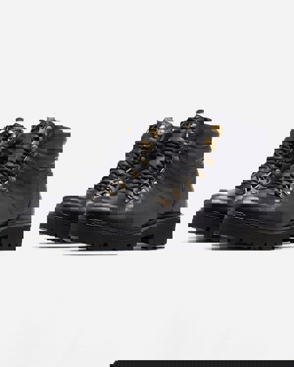 This light weight hiker is made from Black milled calf leather – a tumbled, grainy textured leather with a soft feel. The boot has a comfortably cushioned collar and tongue and a series of antique brass D-rings and ski hooks to ensure a flexible fit. Includes a tongue guard over the top of the tongue for extra protection from the elements. Inside there is a full leather cushioned insock and a ¾ calf leather lining. The upper is cemented to a Finproject ExtraLight sole - a deceptively lightweight, chunky cleated sole topped with a leather rand.