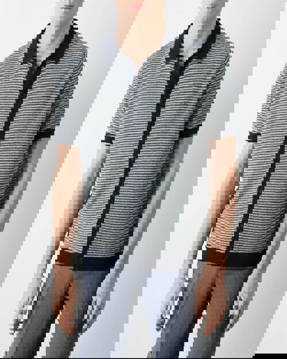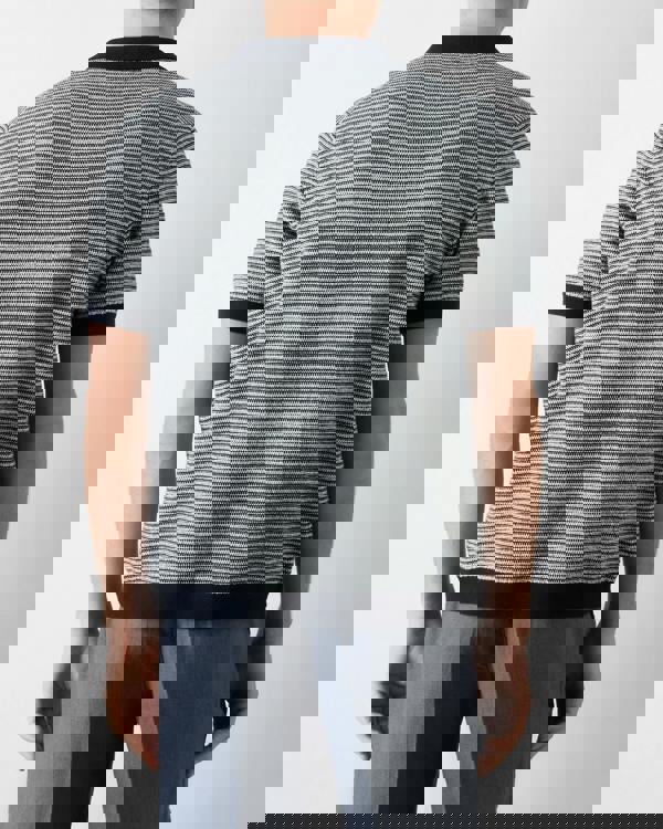 This cotton knitted shirt is a relaxed fit made from a soft 100% cotton yarn with a textured twisted knit forming narrow blended navy and ecru horizontal stripes. The cuffs and straight base are finished with a solid navy double rib stitch and we’ve used a Milano stitch for the collar and placket – a dense flat double knit with good stability. The shirt is trimmed with natural horn buttons.