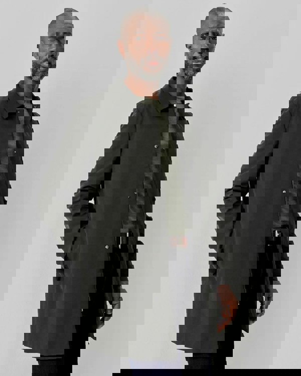 This versatile mac is made from a finely woven, cotton blend fabric in dark navy, with a contrasting khaki collar stand. The showerproof fabric, which will also cut out the wind, is lightweight with a matt finish. The minimalist style has clean lines with concealed pockets vented in the side panel seam, a concealed placket covering a zip and four press studs and a single rear vent. Inside, there are two jetted breast pockets and a full lining, which provides some warmth. The mac has a straight fit and is cut at a shorter length, which gives the versatility to double up as a jacket in the cooler months.