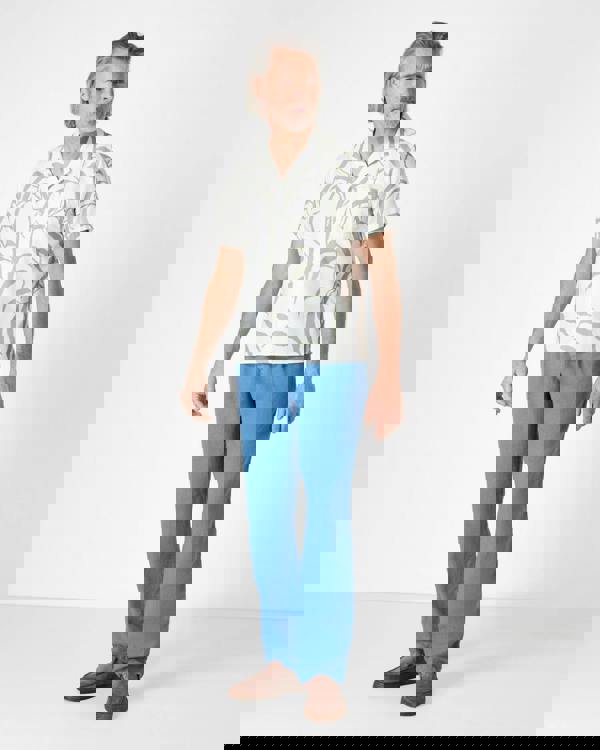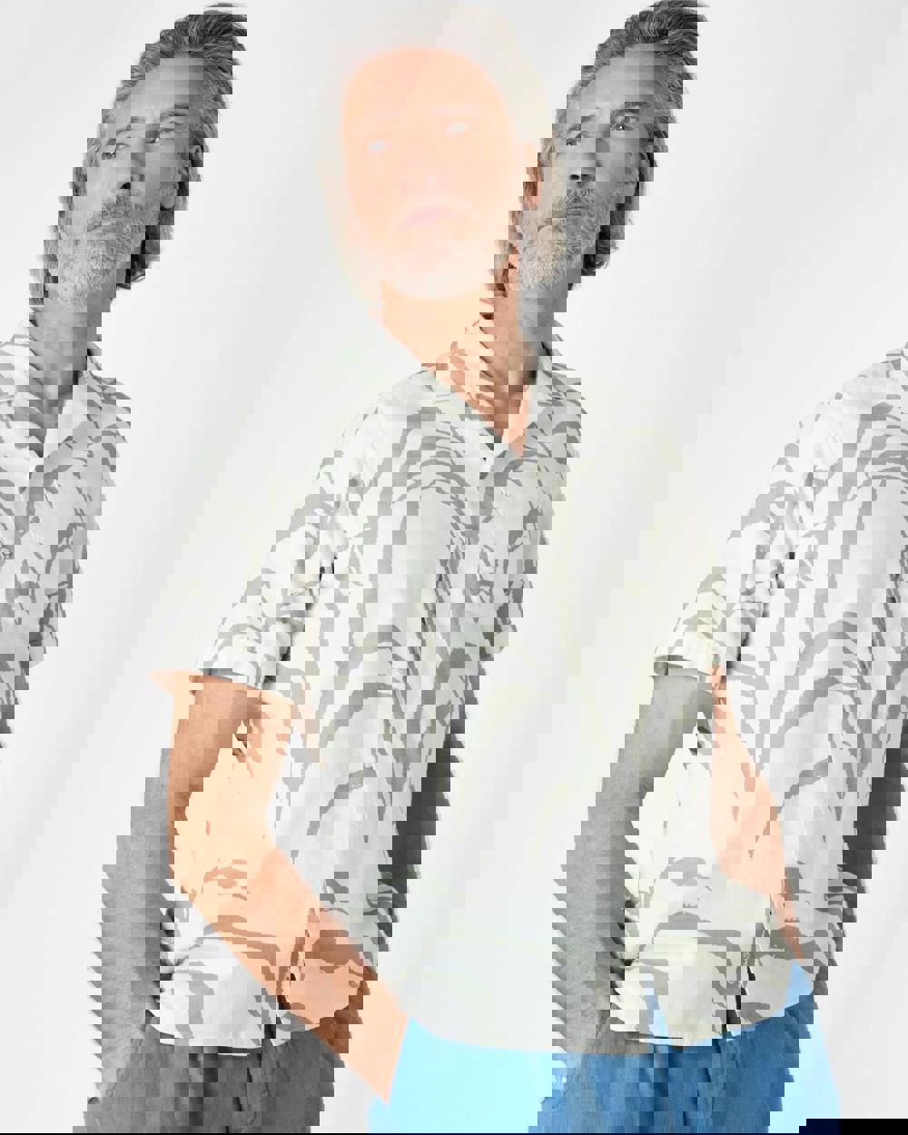 This Riviera summer shirt is made from a soft cool 100% cotton fabric in ecru with a contrasting khaki bold leaf print. This relaxed design features an open neck unstructured collar, short turned up sleeves, a single breast pocket, a lined yolk with a rear box pleat and straight hem with side vents.