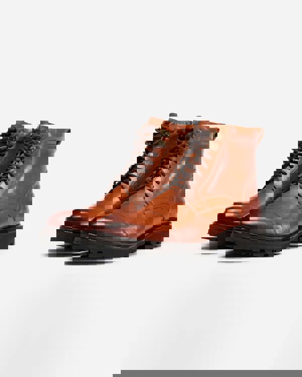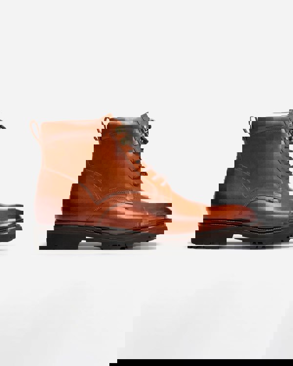 This zipped boot is made from dark tan calf leather, antique finished by hand. The upper design is a toe cap Derby boot with two top antique brass D-rings and a zip on the inside quarter. Inside there is a padded collar, a full calf leather lining and half leather insock cushioned at the heel. Set on the Finproject Extralight sole – a deceptively lightweight sole made from a durable compound with a chunky cleated profile.