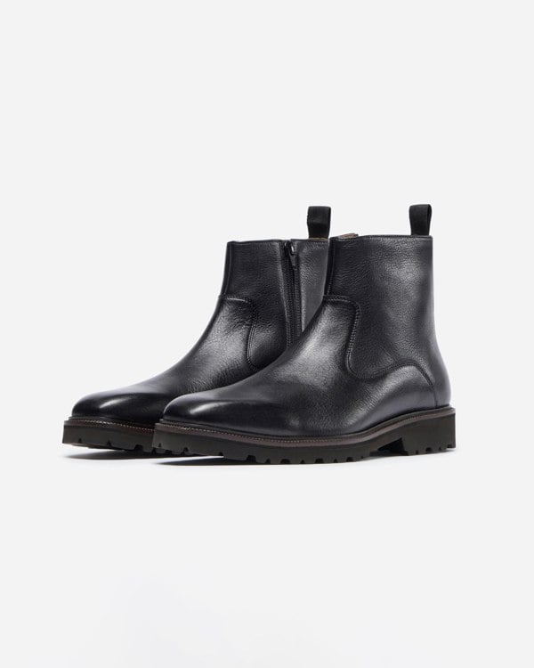 This new zip boot is set on a slightly elongated, square-toed last. The simple classic upper is made from black milled calf leather and has a handy fabric back pull tab. – milled leather has a tumbled, grainy texture with a soft feel. The zip is set on the inner quarter and allows a relatively slim fit around the ankle. Includes a half leather lining and insock with cushioned heel. The upper is cemented to a Finproject Extralight sole – a super lightweight but durable compound with a low-profile cleat.