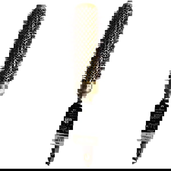 Olivia Garden Blowout Speed Radial hair brush in gold and brown is ideal for customers that want to save time and achieve that perfect faster blow dry. This brush has a longer barrel with 45mm diameter and helps reduce drying time by up to 25% on straight or wavy hair. Comes with a handy pull out barrel pin which attaches on the base of the handle for perfect separations whilst blow drying. In metallic gold, black nylon pins and soft grip brown rubber handle with hole for hanging and separation pin.