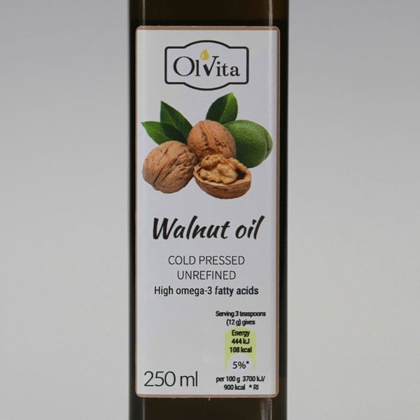 Cold-Pressed Walnut Oil is a natural unrefined oil known for its delicate nutty aroma and exceptional nutritional value. Rich in unsaturated fatty acids, phytosterols, tocopherols and carotenoids, it supports the nervous and circulatory systems and helps improve memory, focus and sleep quality. Regular use strengthens immunity, supports liver and kidney health and helps balance thyroid function. Applied to the skin it soothes irritation, promotes regeneration and restores the natural lipid balance. It also helps firm and tone the skin while providing mild UV protection (SPF 4). Best consumed cold to preserve nutrients and aroma. Perfect for salads, sauces, fish dishes, desserts and cakes adding a touch of refined flavour to any meal.