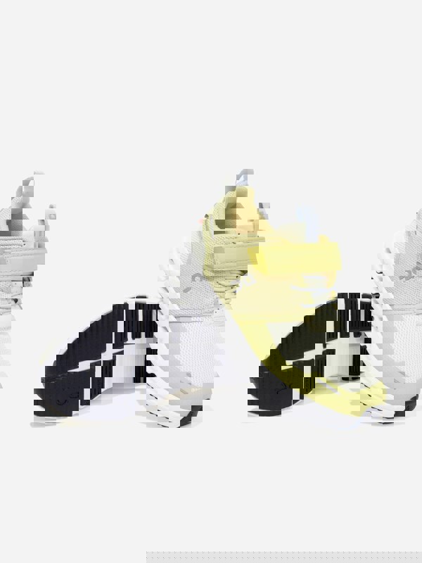 The upper uses recycled polyester across the vamp and quarter, matched with a recycled polyester collar lining. The tongue blends polyester with polyurethane. Finished in yellow.