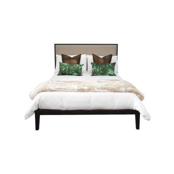 Simplicity meets uniqueness in our Orchid Bed. With a design that balances comfort and style, it is truly an eye-catching piece of furniture. It has a sleek black frame with matching tapered legs at each corner. A fifth leg has been added in the middle for extra stability. The headboard is cushioned and upholstered partially with soft beige fabric, sectioned in horizontal panels. The cushioning provides softness and texture to contrast the sleek wenge veneer.