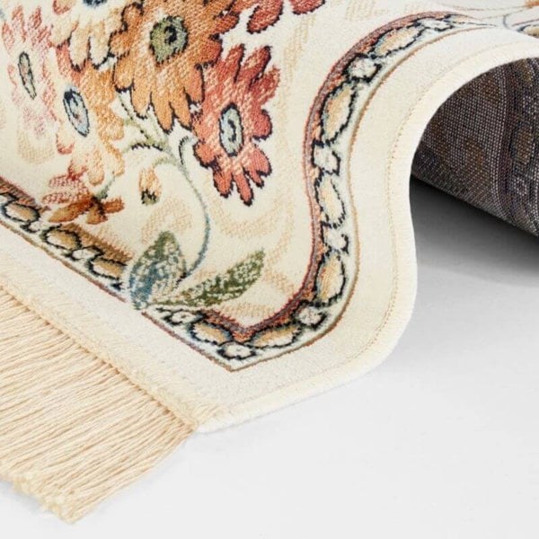 Introduce classic charm and practical elegance to your home with the Oriental Flowers Velvet With Fringes Rug. Its delicate floral pattern, subtle cream shimmer, and lightweight construction bring style and functionality to any room.