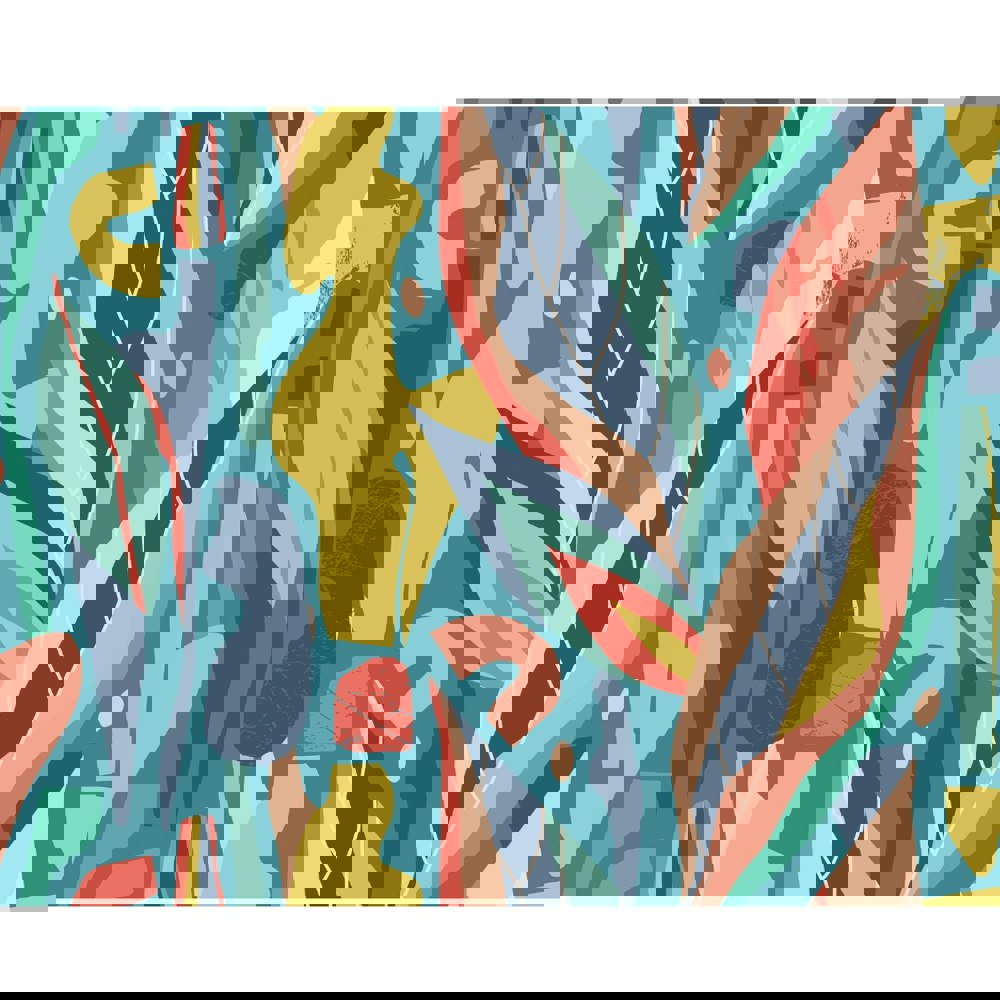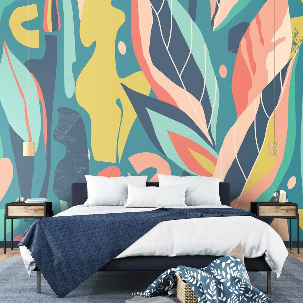 This contemporary wall mural features an assortment of abstract leaf shapes and sculptural representations of the human form. Dramatic and striking, this statement wall mural is perfect for any modern home.