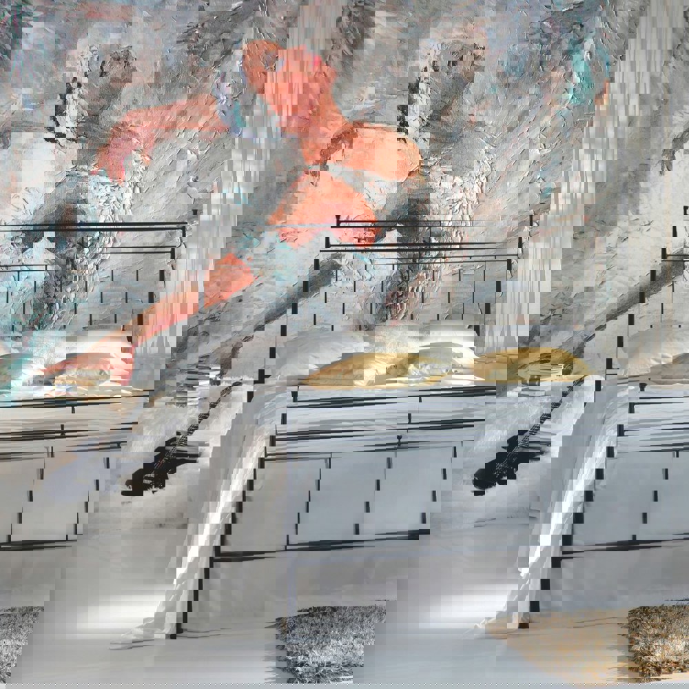 Multi-directional bold stripes criss-cross organically, creating impact and interest. The layering of the stripes introduces a sense of dimension and depth in this captivating design.
