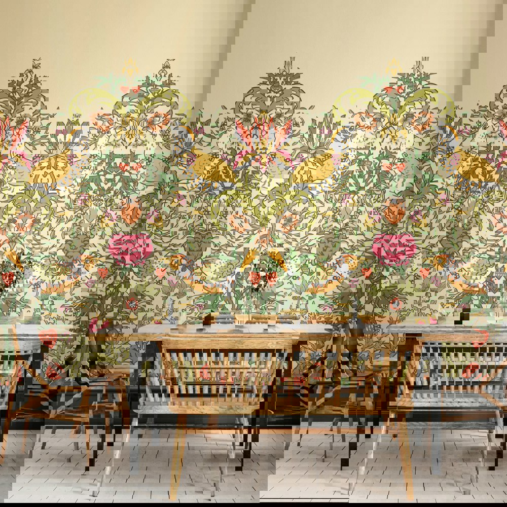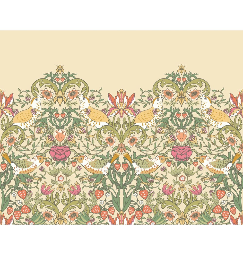 A wonderful repeating design featuring intricate details of naughty thrushes stealing fruit and picking berries. Sweeping flowers and foliage encircle the birds to create a beautiful scene inspired by the iconic William Morris design from1883.