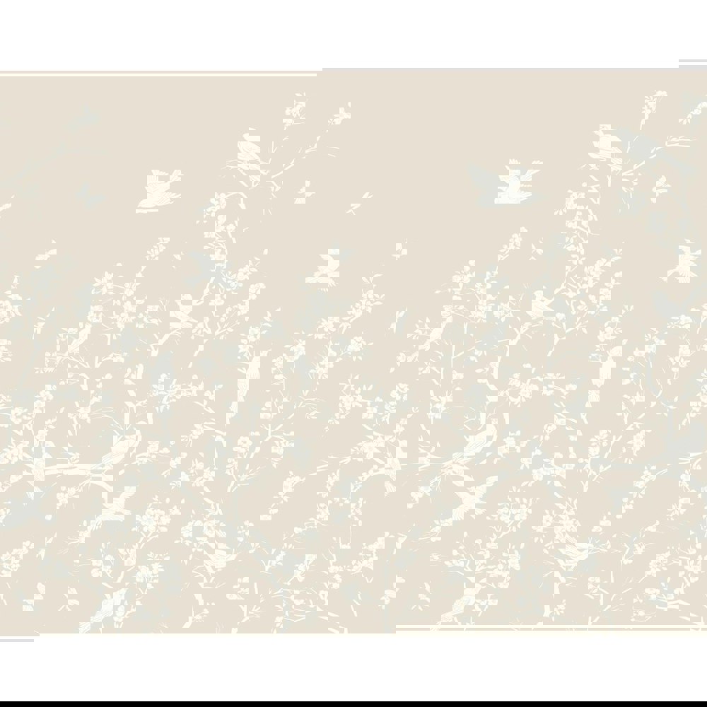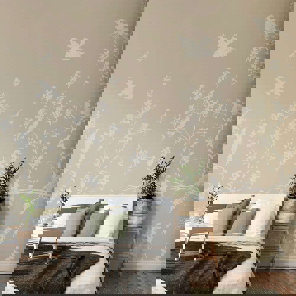 Simple silhouettes and detailed outlines of branches, flowers, birds and butterflies sit against a plain ground in this beautiful and timeless mural design.