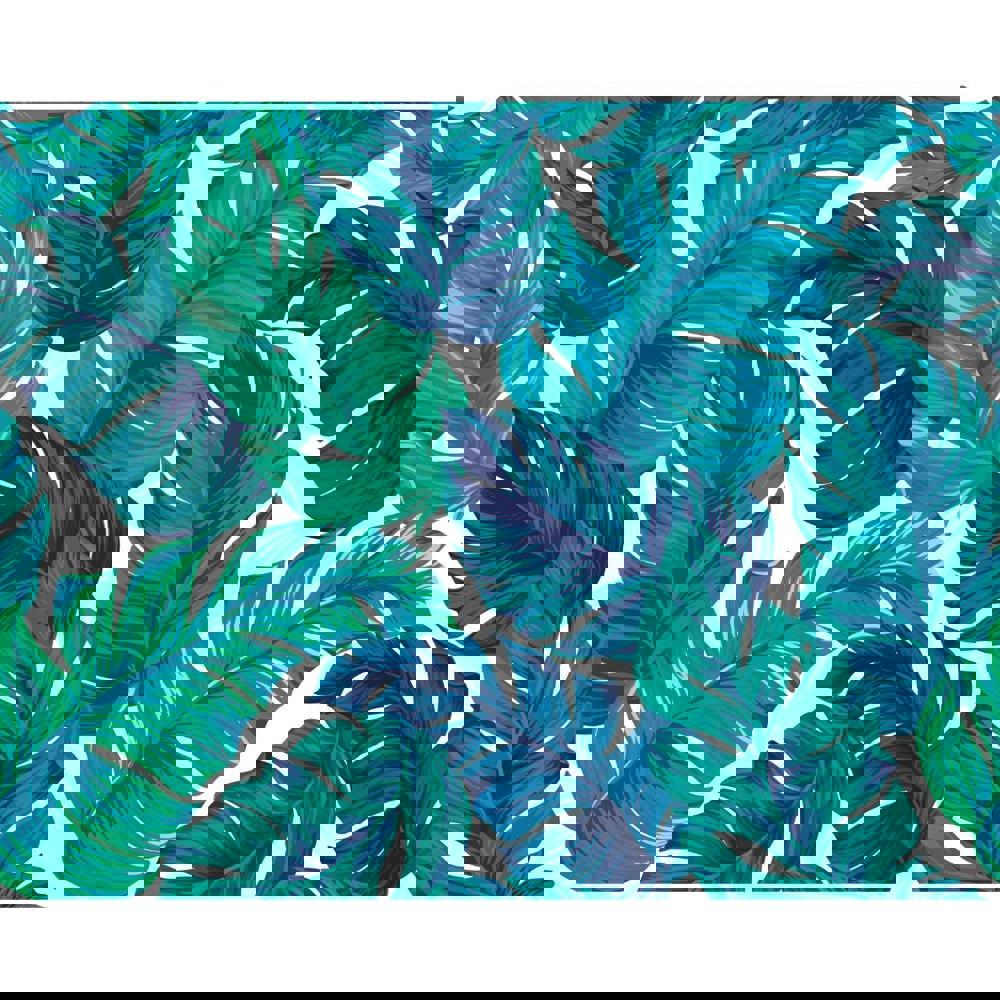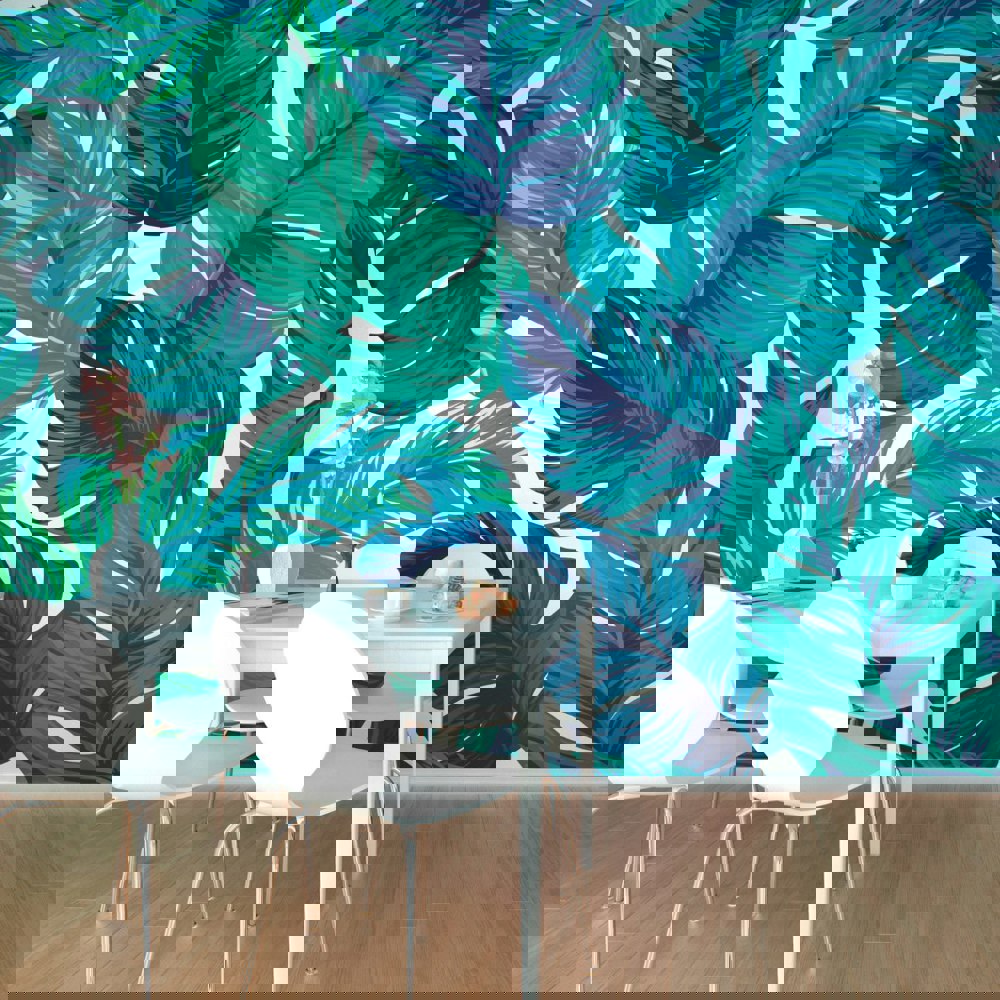 Vibrant colours and beautiful blooms come together in this stunning mural. Birds of paradise perch amongst intertwining palm leaves, vines and flowers in this tropical design.