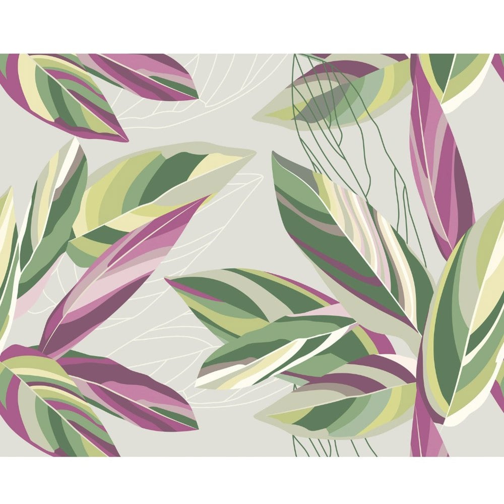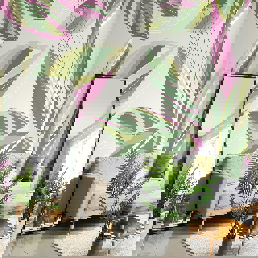This colourful botanical wall mural features bold calathea leaves in an intriguing layered effect. Linear leaf shapes intertwine around the main leaves to add more depth to the design.
