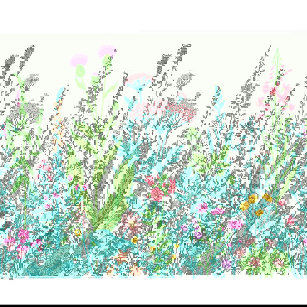 Small intricately sketched leaves and buds create an entanglement of colour and life close to their roots with larger floral blooms flourishing vertically, weaving their way up to striking heights. Shading and fine detailing against a flat ground creates contrast in this striking design.